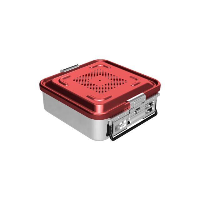 Half-size sterilization containers are used to sterilize, store and transport implants to surgical instruments, surgical equipment and textiles. It consists of two main parts: container and lid. The main bodies of boxes and lids are pressed from 1050 quality aluminum as a single piece and no welding is used during the production of boxes and lids. Decorative anodization is performed to increase the strength of the box and lid surfaces against external factors. There are color options on the lids. There are holes for air on the lid surface, a silicone seal that provides air and water seal on the inside edge, a lockable stainless steel/aluminum/plastic filter holder with a sealing seal around it, which holds the filters placed in the central position on the inside of the cover to filter the air that passes through the cover holes into the box, spring locks on both sides. There are label attachment compartments, carrying handles, and lock pieces through which a plastic disposable security lock passes. Silicone mat, sheet baskets, wire baskets, paper filters, teflon filters and labels are used as auxiliary materials along with containers. They are manufactured in various types and sizes that are pre-designed according to the needs of the users. There are options for hole and no hole boxes and filters and filter holders used in the cover are used in the hole boxes